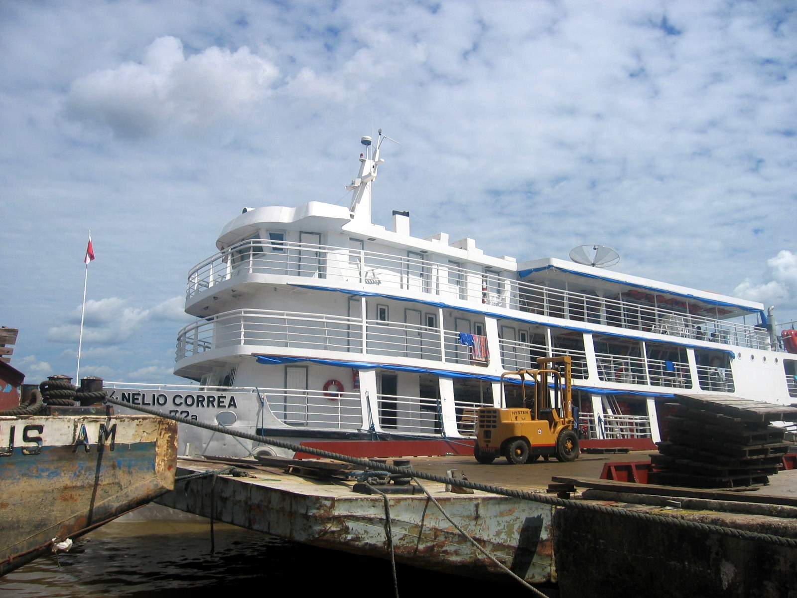 The Nelio Correa is a merchant ship that covers the route from Belem (a beautiful city on the Amazon river’s delta to the Atlantic) to Manaus (the last large city in the Amazonian rainforest). In addition to transporting all sort of cargo, the Nelio Correa admits passengers. Brazilians use these types of ships because they’re much cheaper than the fast boats or planes. Other transportation options in the Amazon can be found on www.stmonline.com.br/lista_barcos_stm.php. On the Nelio Correa, it takes 5 days to cover the approx. 1,000 miles that separate Belem from Manaus. The basic ticket simply gives you the right to hand your hammock (a nice one can be bought in the multiple shops on the harbor, while waiting to depart) in one of the decks.