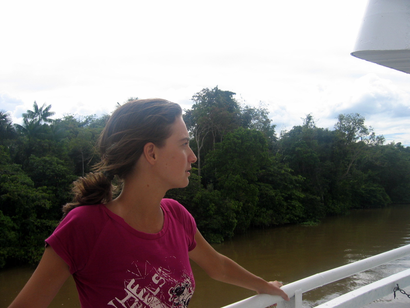 The moment the engines started, we understood why people chose to stay in the lower deck. If the noise wasn’t annoying enough, every night there was a tropical storm, and even though we were somewhat covered, we would end up completely soaked. Unbelievable that I studied 6 years of Industrial Engineering! Despite all these, the trip was pleasant, it felt very authentic to share time with the locals, and seeing the sunrise and sunset over the Amazon was wonderful… Some days we would spot birds, giant butterflies or river dolphins, and at night the stars would be spectacular. My favorite part was when we passed a village and the kids would paddle from the shore in their canoes, throw hooks on the boat and climb on board to sell shrimp (at $1 per kilo!), bananas, etc. It gave me a break from the boat diet of rice and farinha.