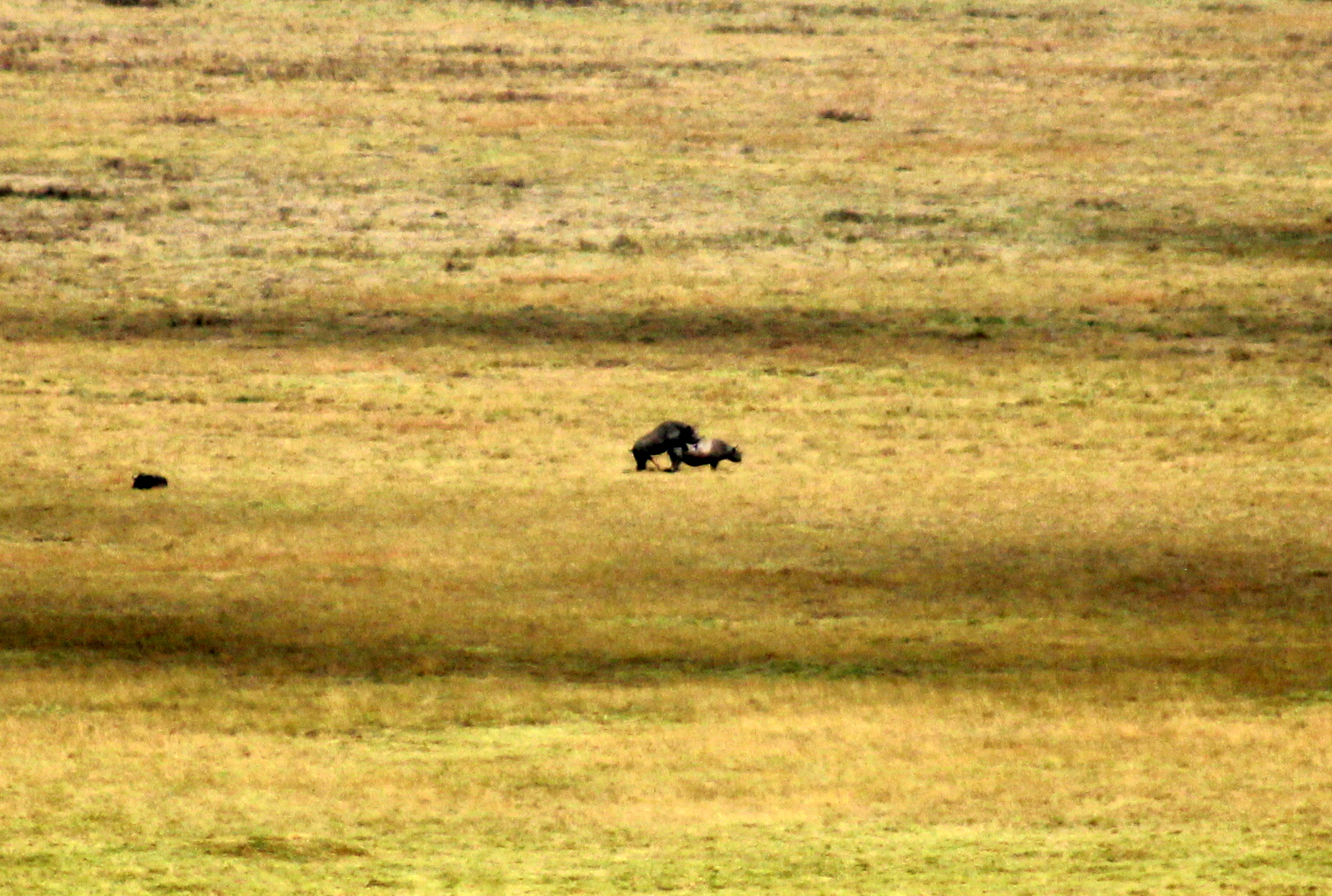 We took a lunch break at a picnic site by a swamp with hippos, where we were attacked by an African hawk who stole Elena’s chicken wing… and nearly her finger. Back in the jeep, we asked our driver to focus his efforts on finding rhinos, since it was the only animal we had barely seen (a distant spotting in Maasai Mara counts?). A few minutes later we spotted a couple of black rhinos, though they were really far. We continued driving up to an outlook, to get the view that heads this entry… and suddenly we saw the rhinos much more clearly. Wait, what are they doing? Ahhhhh. Well, with only 35 black rhinos left in Tanzania, it kind of felt good to witness their reproductive cycle. Hope there is a new baby in the family 15 months from now!