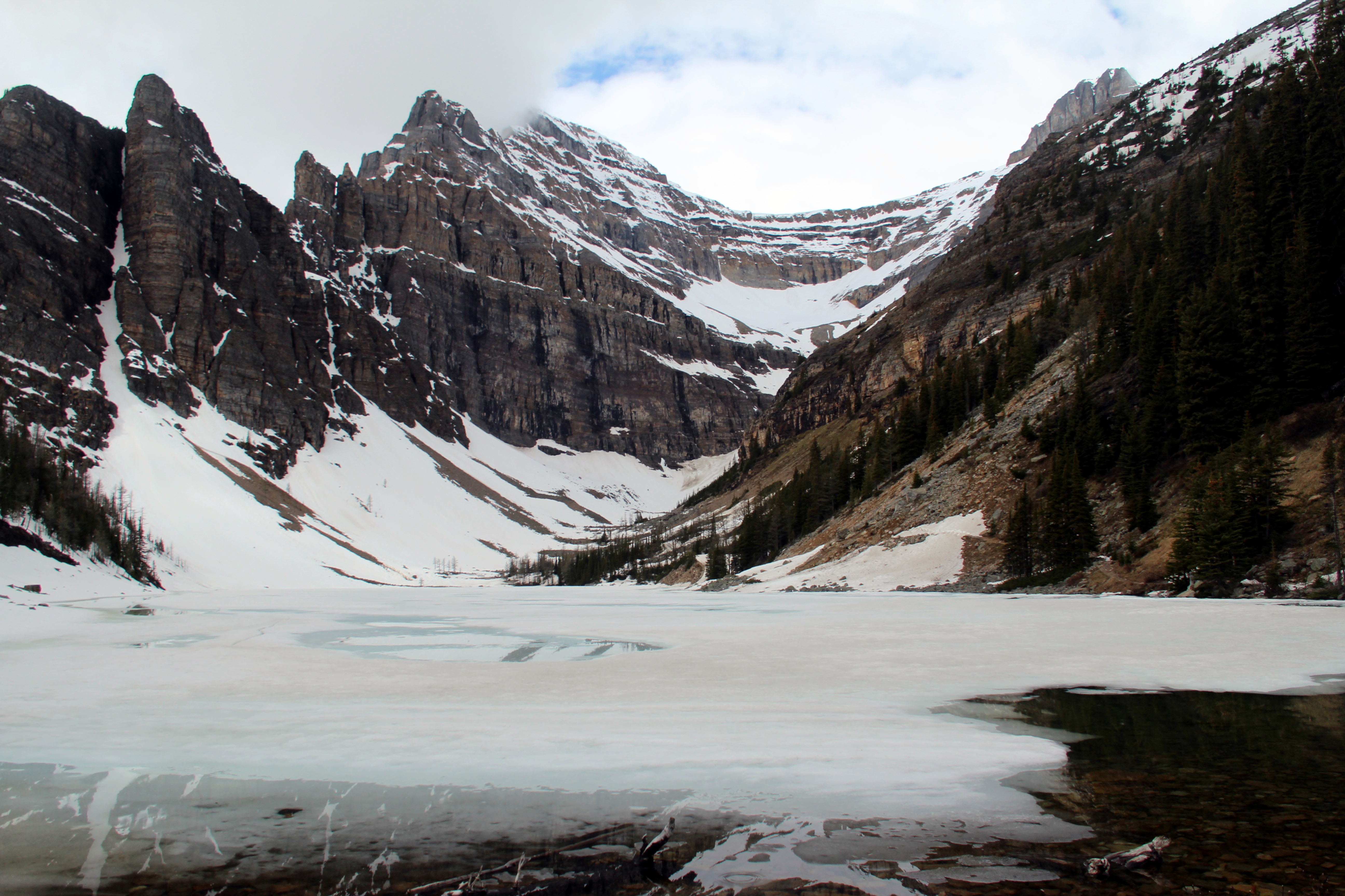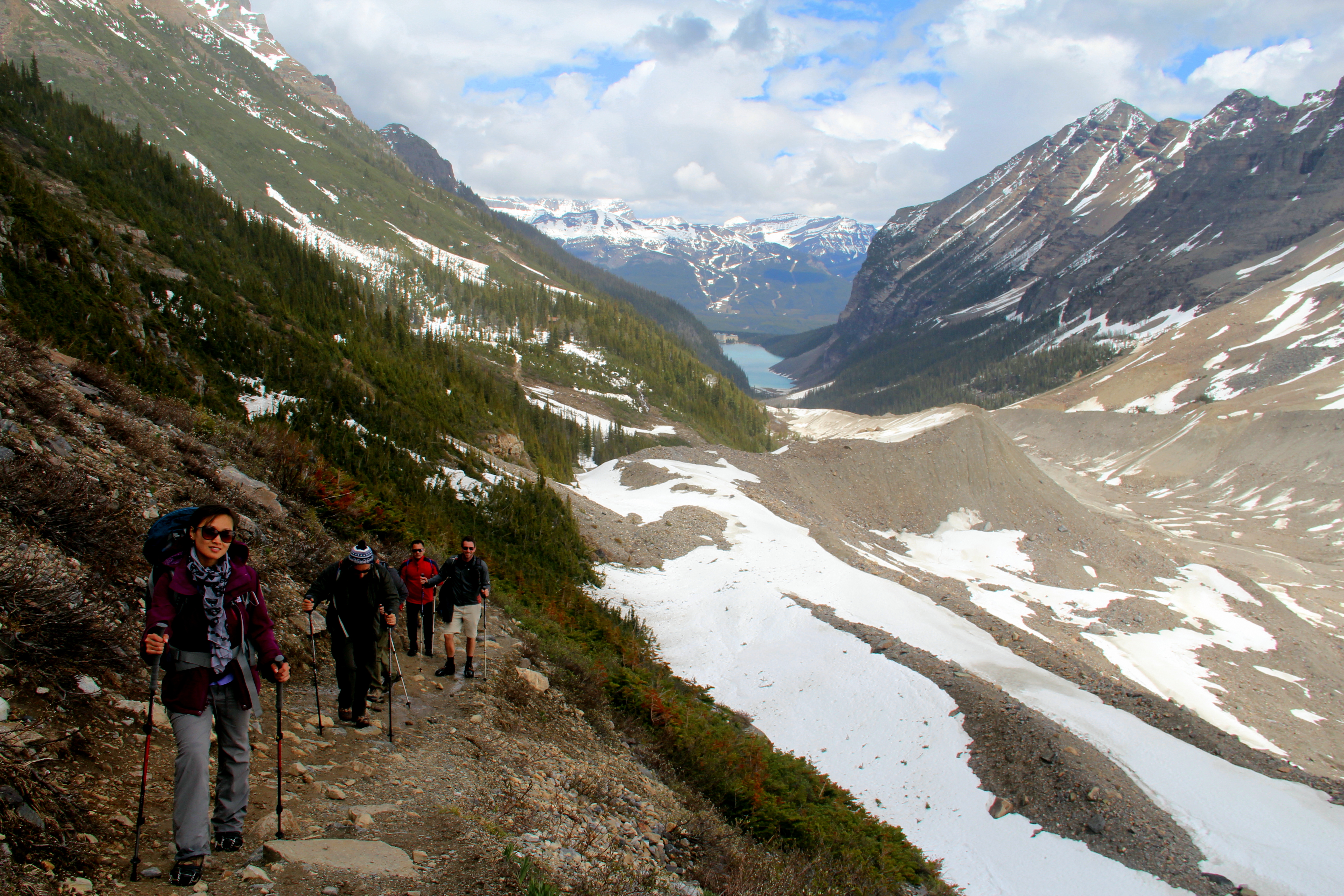 The trail from there is completely covered in snow, we put our microspikes on, and at times even doubt if we took the wrong detour. Eventually, we converge with the main trail that connects Lake Louise with the Plain of Six Glaciers (if you don’t combine it with Lake Agnes). We hike on the hillside, enjoying spectacular views of mountains, glaciers and the ever further lake. We feel like we’re in a an episode of Game of Thrones!