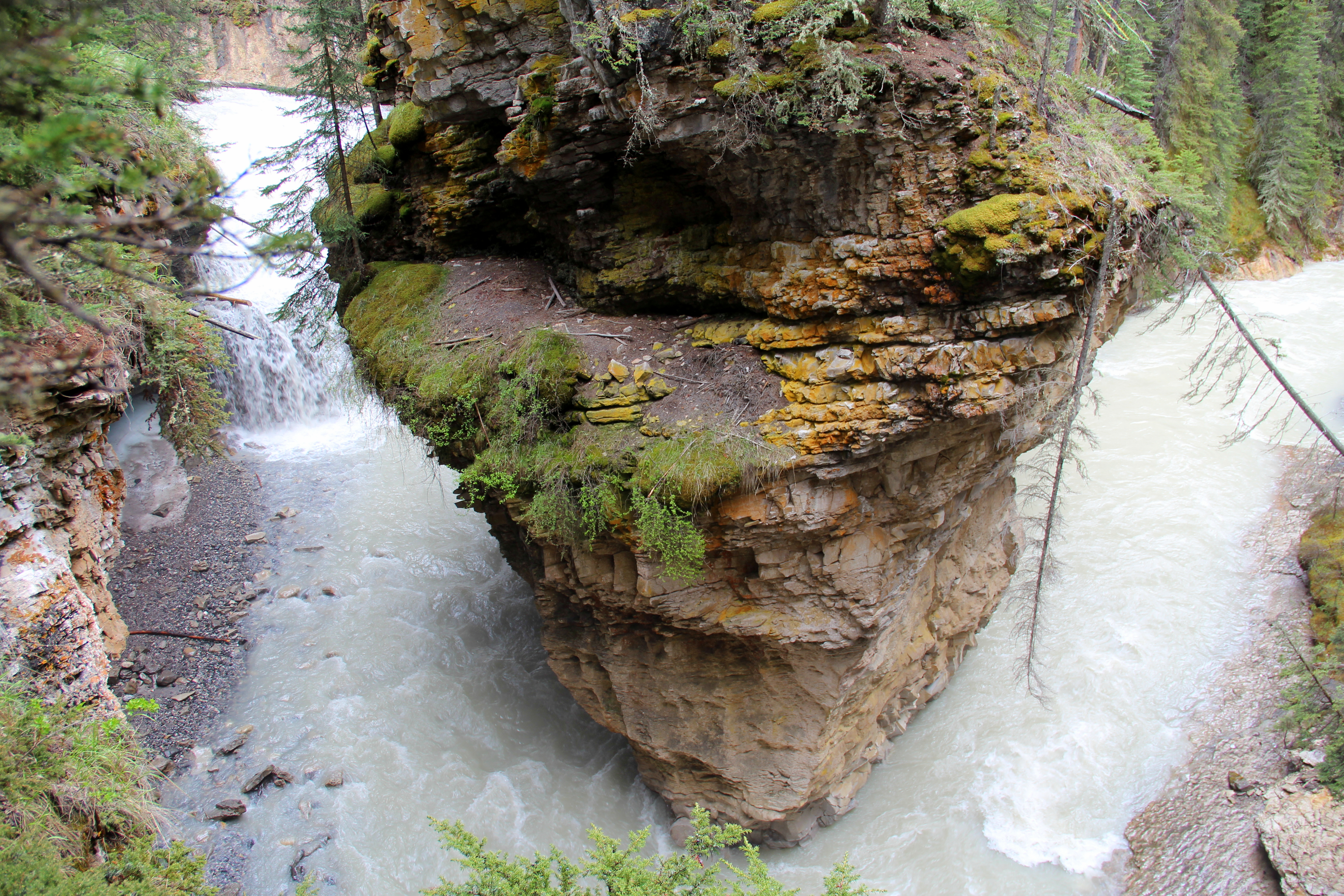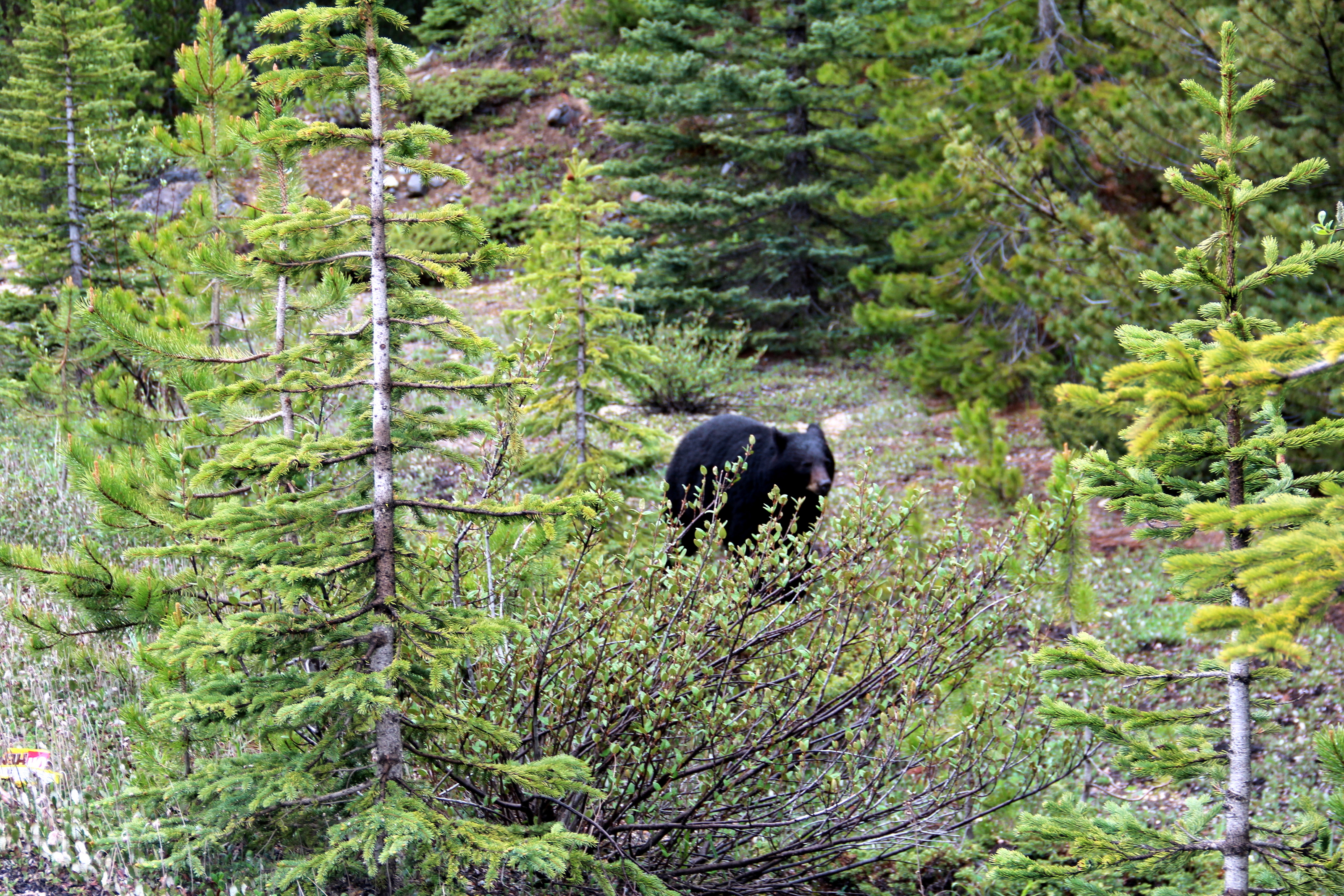 We drove a bit further to Athabasca Falls, almost all the way by Jasper, and it’s definitely worth the extra distance. Not for the waterfalls themselves, but for the beautiful river, the gorge and potholes it carves by eroding the quartz and limestone borders. A system of trails and platforms allows to view and photograph all the angles. We’re 200 km north from Lake Louise, and it’s time to start the drive back. But there is time for one last surprise: another black bear! This time, it’s really close to the road, quietly eating flowers… and it almost looks like a plush toy you could hug 🙂