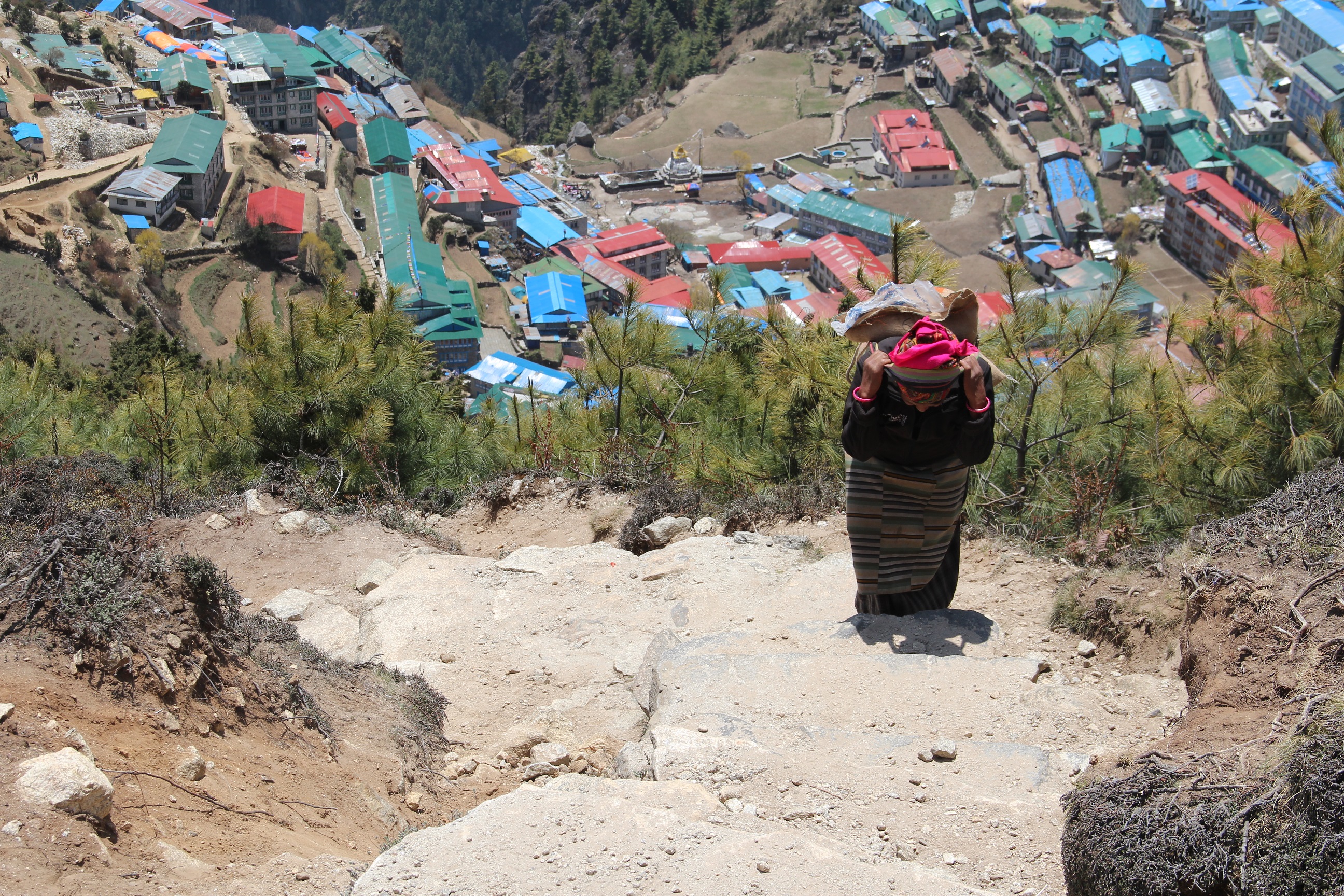 We booked flights to Lukla, rented some mountain gear in Thamel (down jackets, sleeping bags, hiking poles and goretex pants), and were ready to go. After a mere 24 hours delay (quite common for this route), we finally took off on the morning of May 1st.The highlights of the 25 min flight were the views of the Himalayas (try to seat on the left side of the plane) and the crazy landing on the short airstrip trapped among giant mountains. We walked into a teahouse to get some hot cocoa and re-assess the situation post-earthquake, talking to people that were coming down. The were more good than bad news, and we were more decided and excited than ever; it was a go. We interviewed a few porters and decided to go with a 30-something local named Lama. His English was very limited, but he had ties in the Lukla community, a cellphone, and knew what to do in case of emergency. For $15 per day, he would carry our big backpack, and cover his own accommodation and food.