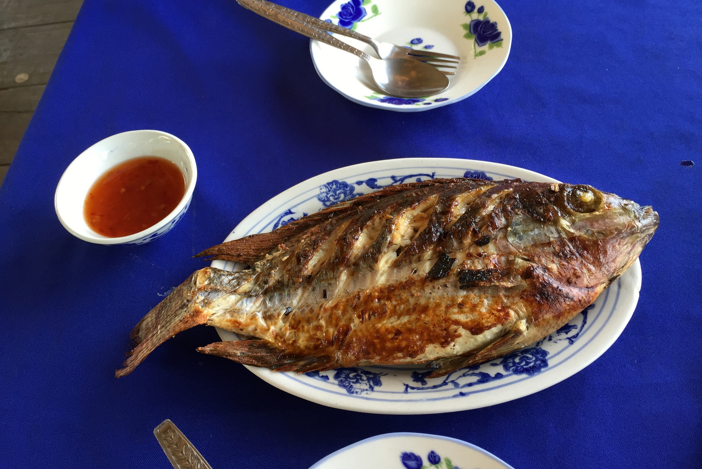 Suddenly, a ton of tourists arrived… that was our cue to leave. Before exiting the park, we stopped at the bear rescue center, where a dozen or so black bears played around in a protected area, having been rescued from poachers. We got back to Luang Prabang right on time for lunch, and found a quiet local restaurant over the Mekong river, where we enjoyed the yummiest grilled fish ever. We walked around the city one last time before packing and going to the bus station to catch our ride to the Plain of Jars.