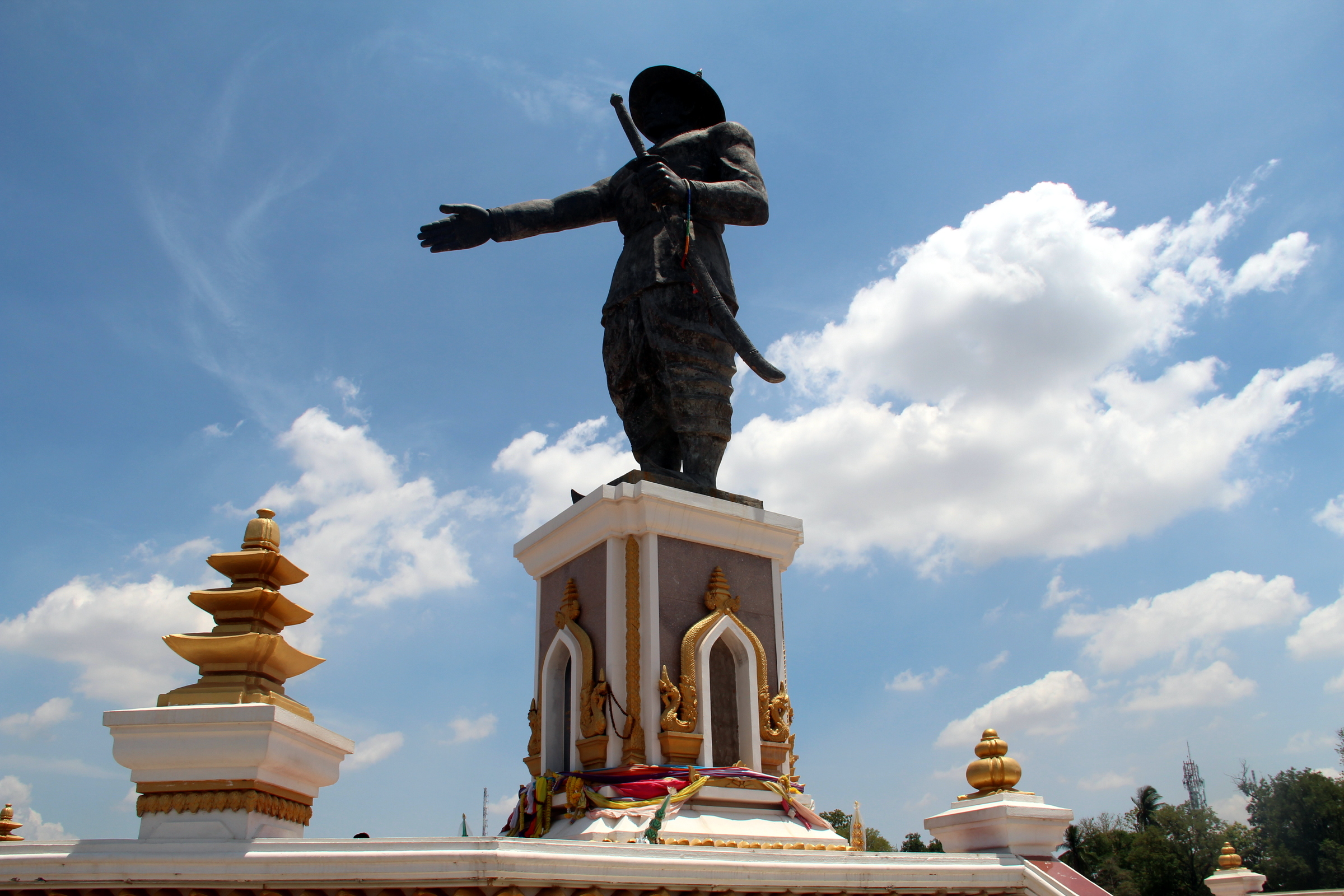 Then we took a tuk-tuk to Patuxai, from where we would walk the city toward the southwest. Patuxai is a sort of Arc de Triomphe, reminiscent of the French influence over the country, although with four pillars instead of two and Laotian ornamentation. We climbed to the top via the internal staircases, full of local tourists and souvenir shops, and took in the sight of modern Laos. From there, we walked past the rather uninteresting city market, the old stupa That Dam and the Presidential Palace. We reached Wat Si Saket, a wonderful temple with thousands of Buddha figures in pigeon holes. And then made it to the Mekong promenade, a new park with a big statue of King Anouvong and several restaurants, where we got one more fruit shake.