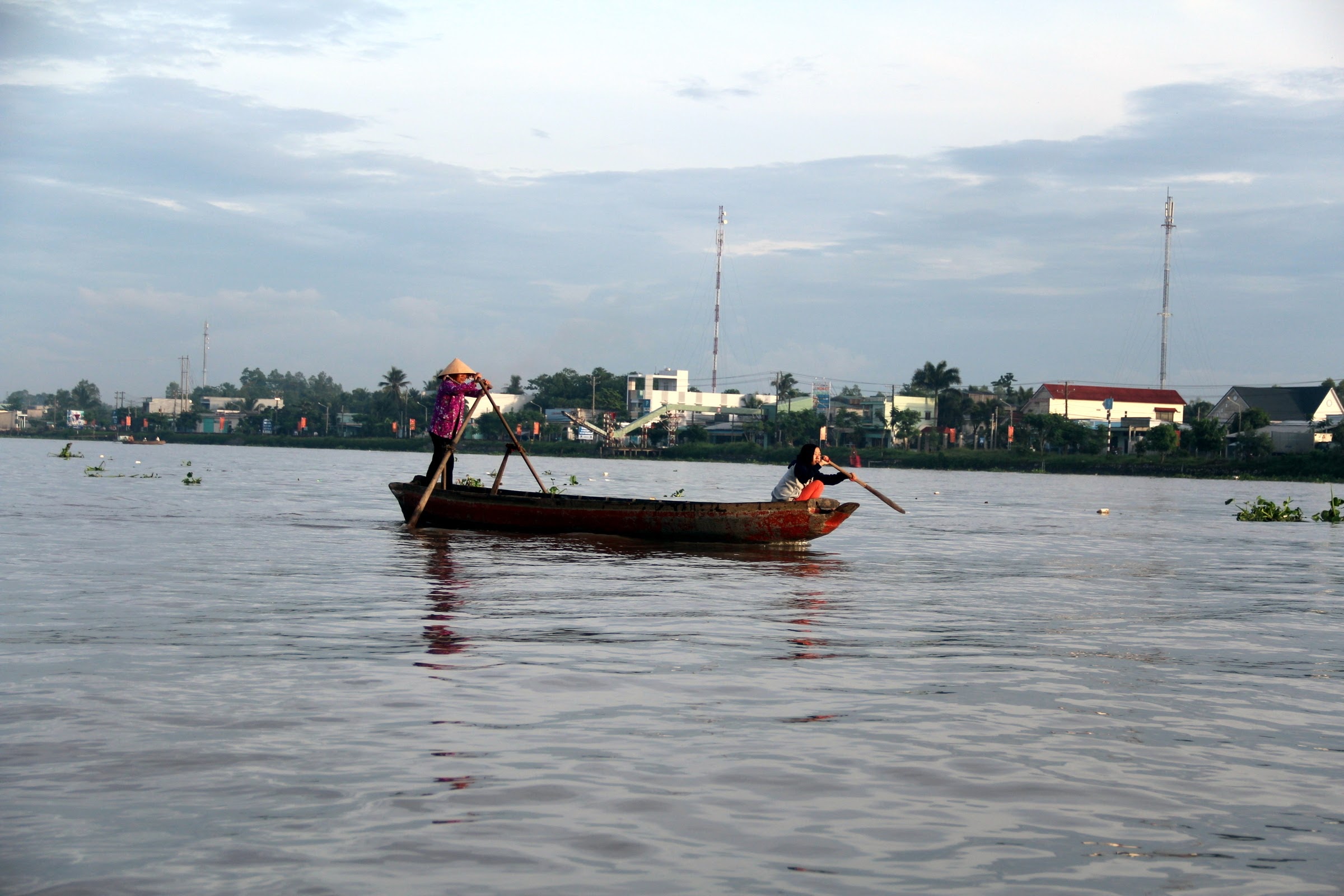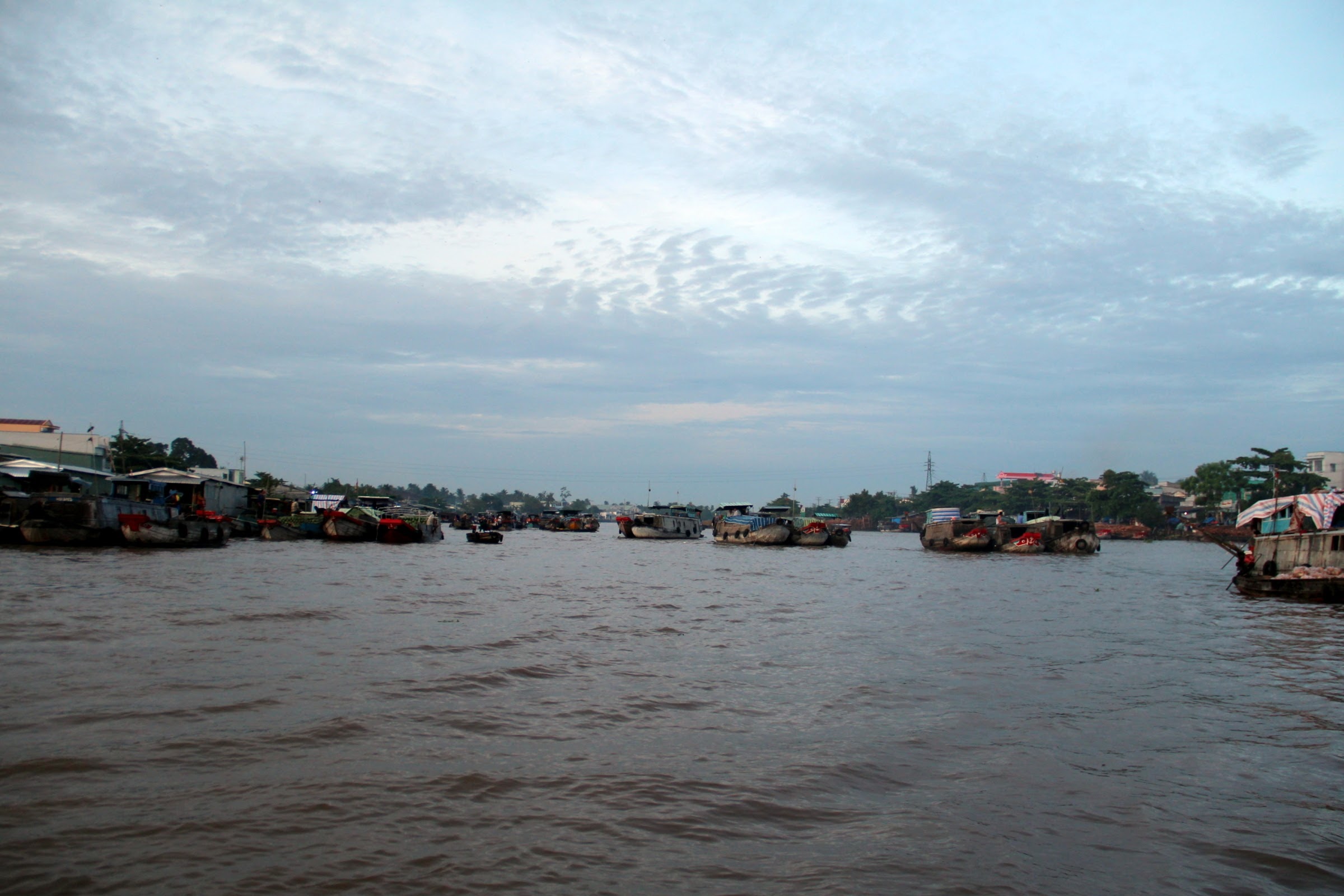 Since we wanted to check out two floating markets, Cai Rang and Phong Dien, and they are most active before 8-9am, we had arranged our boat tour to start at 5:30am, and we needed to go to bed early. Full and tired, we passed out quickly… only to be woken up at 2am by the noise of trucks being unloaded, fish and produce being traded. Lesson learnt: don’t stay close to a market. When we walked to the river, the old lady who had sold us the tour, and who seemed to run a cartel of boats, was waiting for us with our boatman. Soon we were underway, as the sun fought to come out of the horizon and among the clouds. In about half an hour, we arrived at the Cai Rang market area. There were tens of large wooden boats, quietly floating in the middle of the brown river. Each one of them had a stick with a fruit or veggie hanging up high, so that buyers could tell from far away what they sold. Smaller boats would approach them to bargain, and once a deal was reached, the produce would be thrown over.