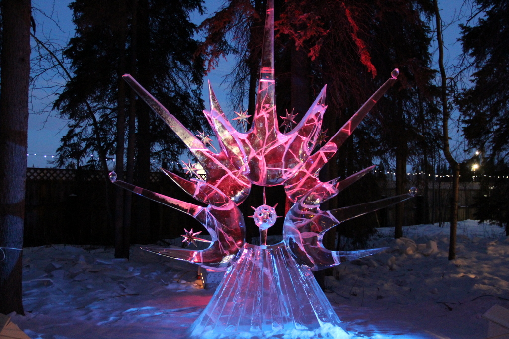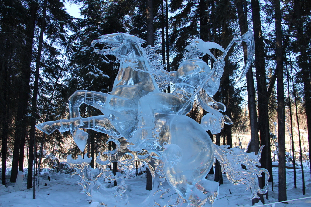 We walked back to the central area of the park to play with some of the sculptures from the amateur, un-judged Open. And then we made our way into the forest, where the single-block sculptures were protected from the sun. These were even better than the multi-block ones, if possible. They were delicate sculptures, like a ballerina, intricate ones, like a reaper, and even funny ones, like the mars rover. We loved our time at the Ice Park… and couldn’t wait to come back at night.