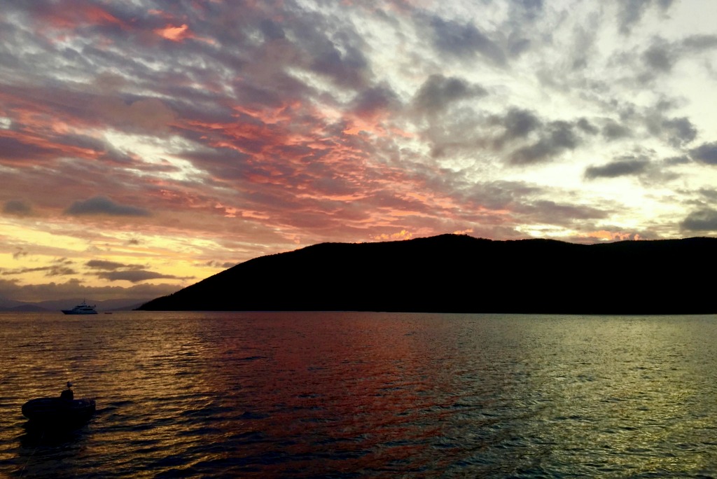 So we landed in Proserpine, took the shuttle bus to Airlie Beach, and checked-in at the tour operator office, where we were able to store our bags. We had a couple of hours before we had to embark, and we spent them picnicking on the beach, avoiding drunk youngsters (apparently Airlie is a big destination for Schoolies, a sort of Spring Break for Australian high school graduates), and slowly making our way to the harbor over a nice shore walkway. We boarded our boat, a 40-ft or so catamaran, and met the captain and first mate, two middle-age, humorous Aussies. Our accommodation was simple, mainly bunk beds in open areas, but it always felt homey, probably due to the abundance of food at all times 😉 We got on our way and started to enjoy the beautiful ocean and soon after, a perfect island sunset. And we even got to practice a man overboard drill, when my hat was taken by wind!