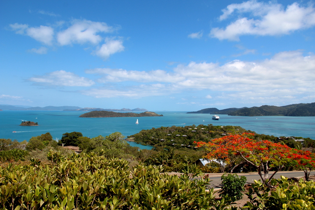 Then we stumbled upon some tourist info, pointing out some lookouts. We set to the nearest one, One Tree Hill, but soon realized that it was too far and steep for us to hike up with up with our backpacks under the sun. Hamilton Island doesn’t have cars, let alone taxis, and resort staff and tourists move around in gold carts. So we tried to hitchhike one of those… and got picked up in no time. The panorama from up the hill was fantastic, 180 degrees of deep blue ocean cut by lush islands and occasional ships. From there, we walked down a bit to another great vantage point, this one overlooking Hamilton Beach. And then we hitchhiked again to get down to the beach itself, where we relaxed in the hotel lounge chairs until it was time to hitchhike one last time to get to the airport. Oh, Australian people are so nice!