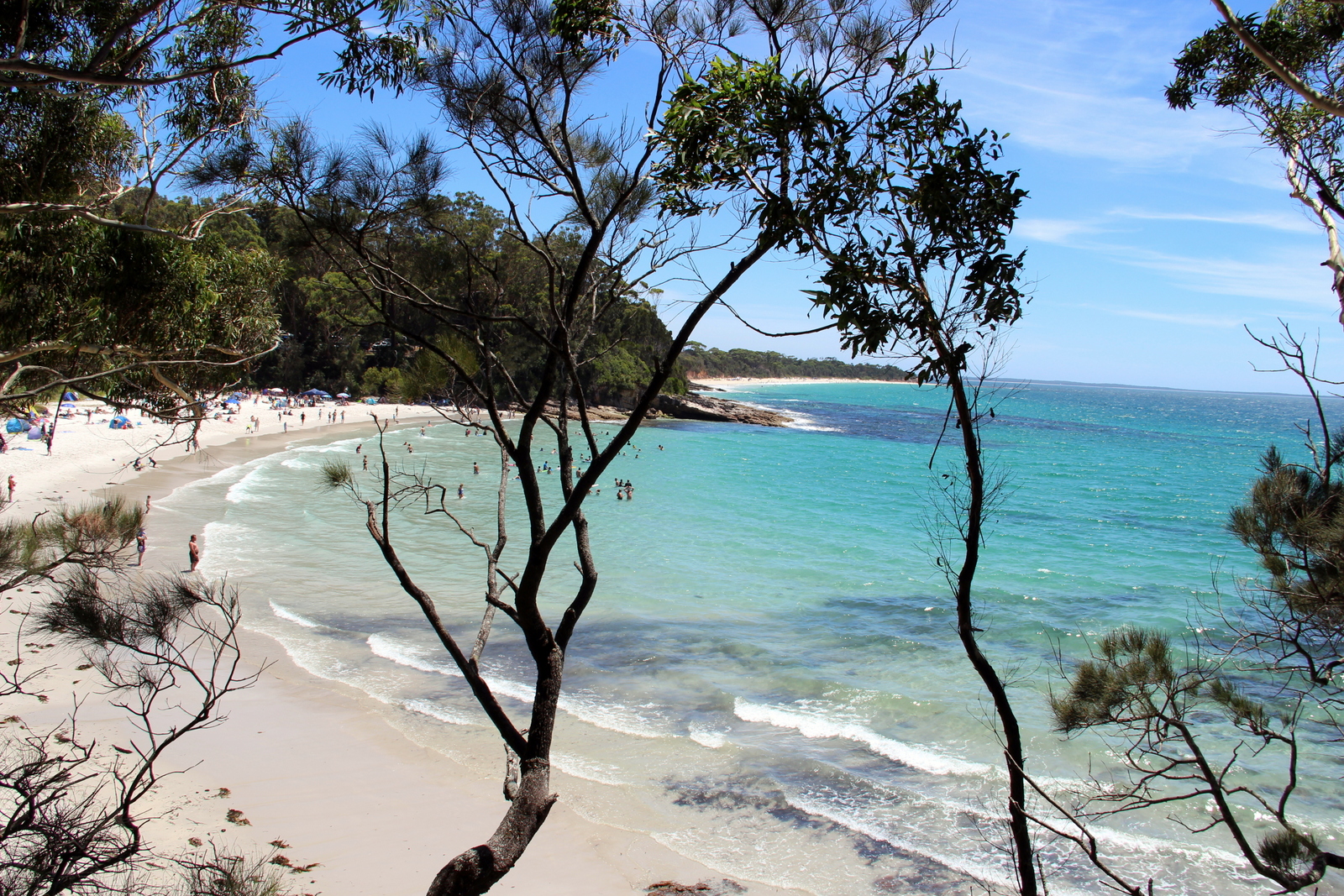 The best way to explore the area is to take the White Sands Walk, a short and easy hike along the coast, sometimes going up through the trees, sometimes walking directly on the sandy shore. Most people park at Greenfield Beach and hike south to Hyams Beach and back. We hadn’t done much research, so we first took the trail northbound. The views were some of the best we’ve seen, with the juicy water popping up behind the tree branches and splashing against dark rocks and light sands. We walked in flip-flops, taking them off to enjoy the thin sand and the fresh water every time we stepped on it. Eventually we hit Plantation Point, at the end of Nelsons Beach, where the water was absolutely crystalline… and we realized we had been going the opposite direction, though we were so glad we did.