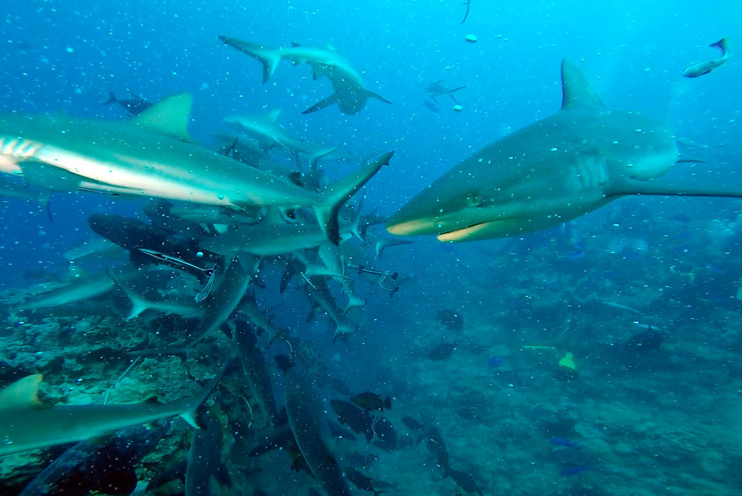 For a minute or so, the shark jerked violently trying to break the box, while a few others tried to attack the box themselves. Eventually it broke, and pieces of tuna spread out. Then everything appeared to go on fast-forward, with tens of sharks flying around trying to get their part, and some giant potato cods joining in too. We couldn’t believe all of this was happening a few meters in front of us!