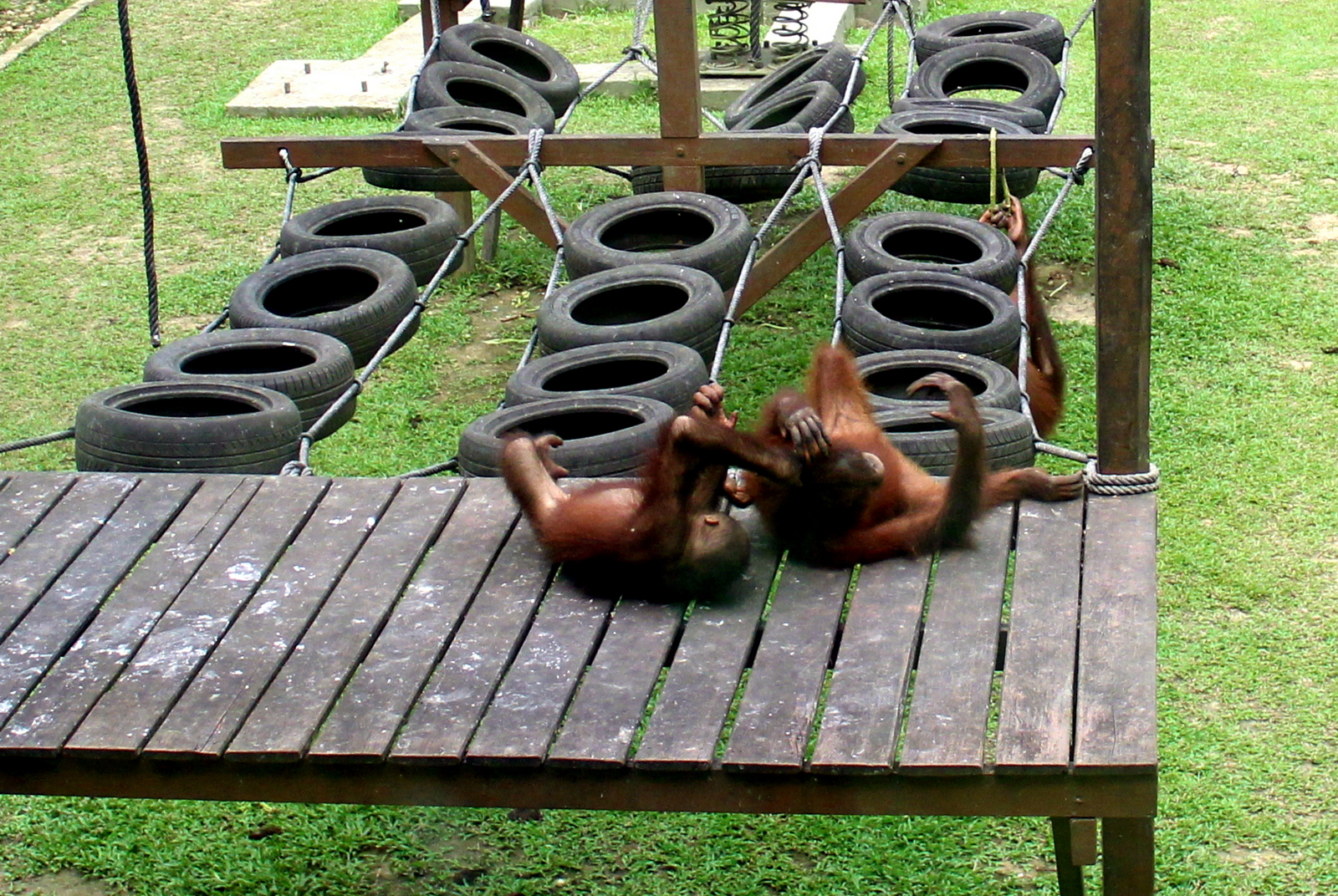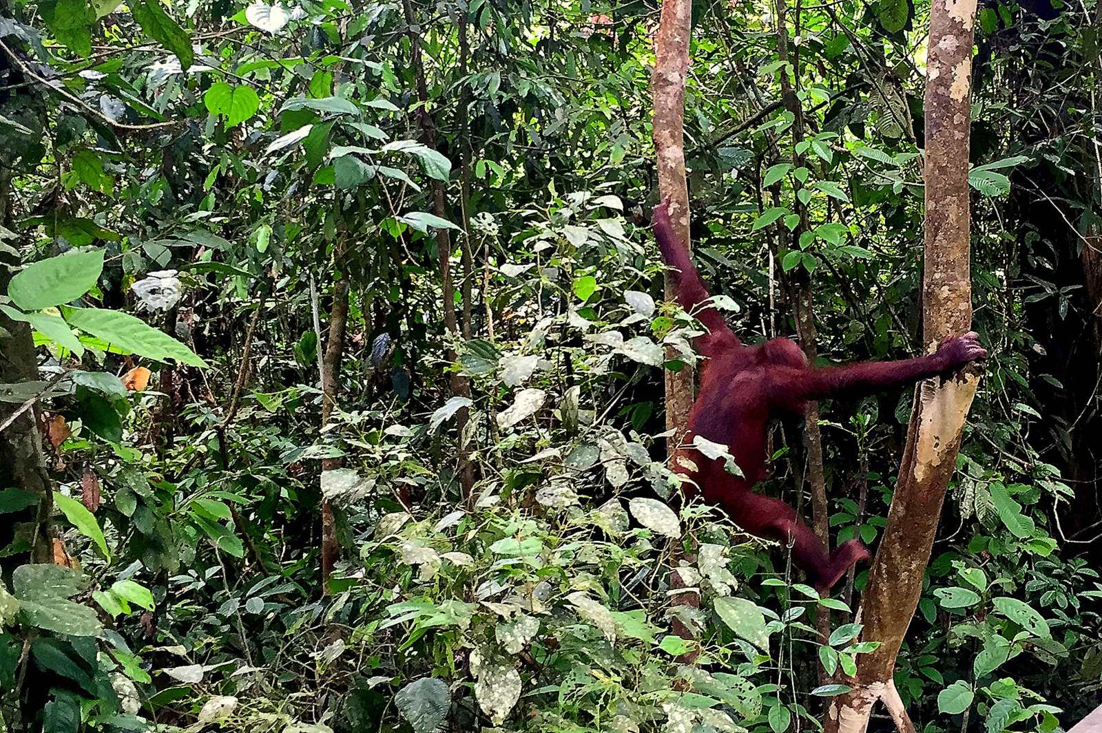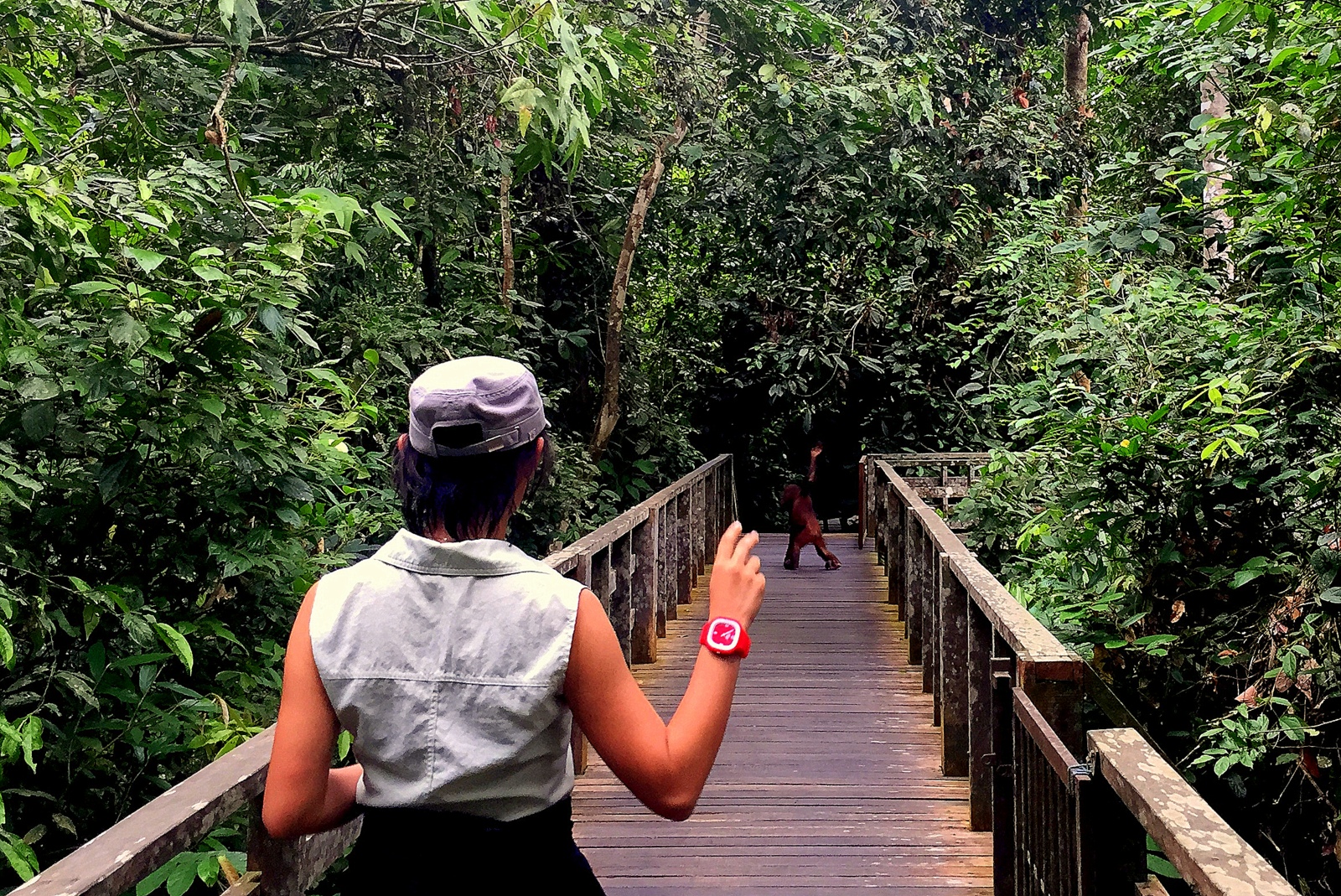 Every once in a while, we would hear sounds in the trees, look around and catch a glimpse of an orangutan jumping through the branches. Other times, it would be much easier, and we would stumble upon them sitting on the railings or crossing the walkways. We also spent some time in the nursery, observing the youngest apes eat and play… they were adorable 🙂 The reserve actually closed for a couple of hours in the middle of the day, so we grabbed a bite at a cafe right there, and popped by the sun bear center across the road. We came back in for a final experience: the feeding. It wasn’t 3pm yet, when we saw a mother with her baby coming through the foliage. A keeper eventually walked on the platform and put a bunch of bananas out. The mother dropped on the platform and start gobbling. Then a few other young apes showed up, swung in, grabbed a banana and swung out.