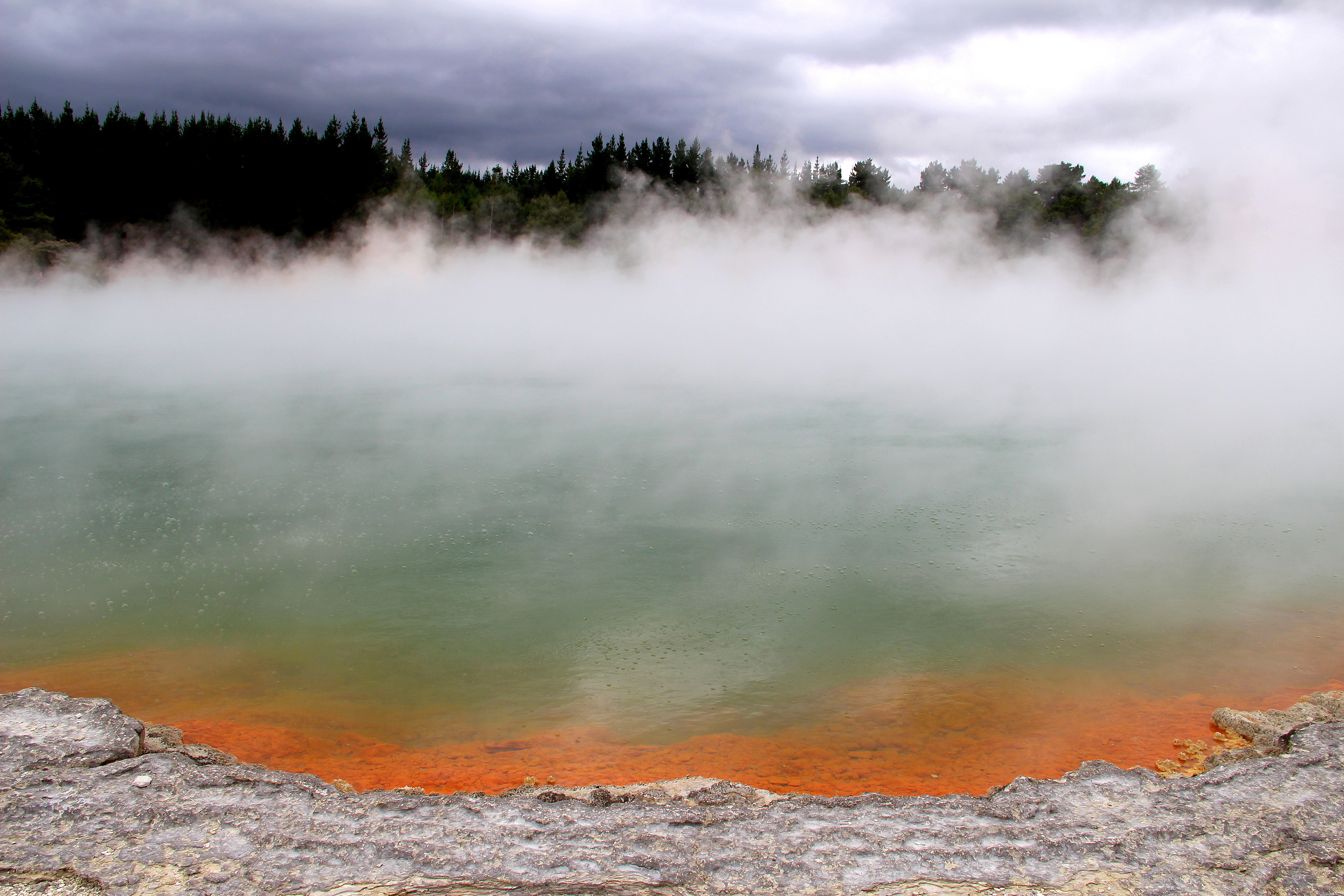 The next morning, we set to explore another place around Rotorua, the Wai-O-Tapu Thermal Wonderland. Our first stop there, the Lady Knox geyser, was disappointing. The park operators force the eruption every day at 10:15am by pouring chemicals into it, and hordes of people congregate for it. The rest of the morning, though, was fantastic, despite the intermittent rain we had to put up with. We hiked the three park trails clockwise, quickly passing small craters and mudpools, and reaching the spectacular artist’s palette area and the absolute highlight: the Champagne Pool.