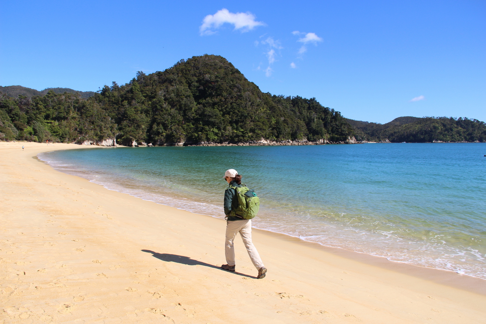 After a couple hours, we reached Awaroa, a breathtaking inlet that made us reminisce of Australia’s Whitehaven Beach. We had timed the hike to get there at low tide, based on the DOC’s tide tables. Overall, we found the website and map for the DOC to be very helpful and accurate for trail descriptions, distances and walking times. We took our boots off and crossed the freezing waters.