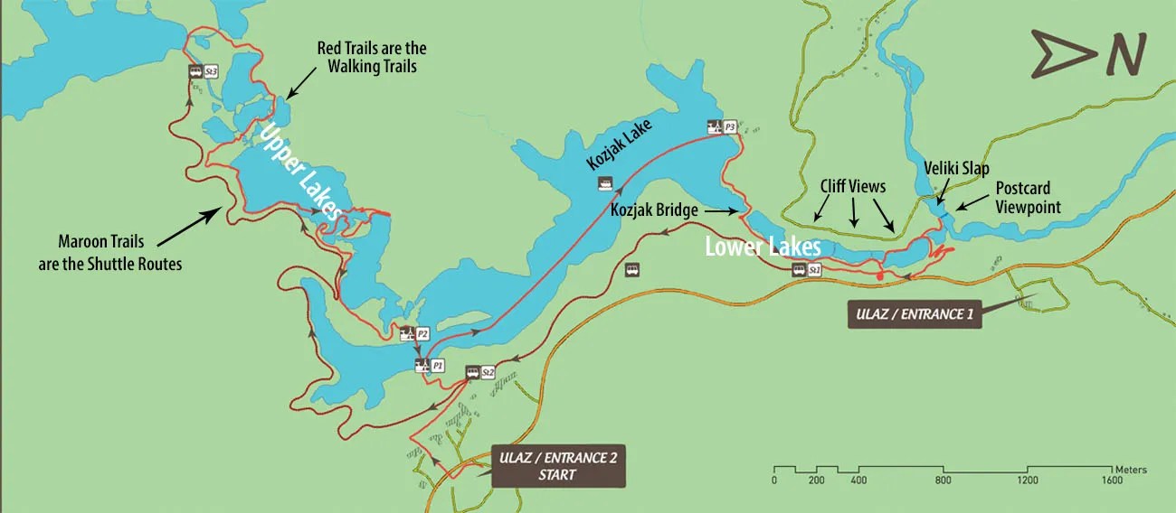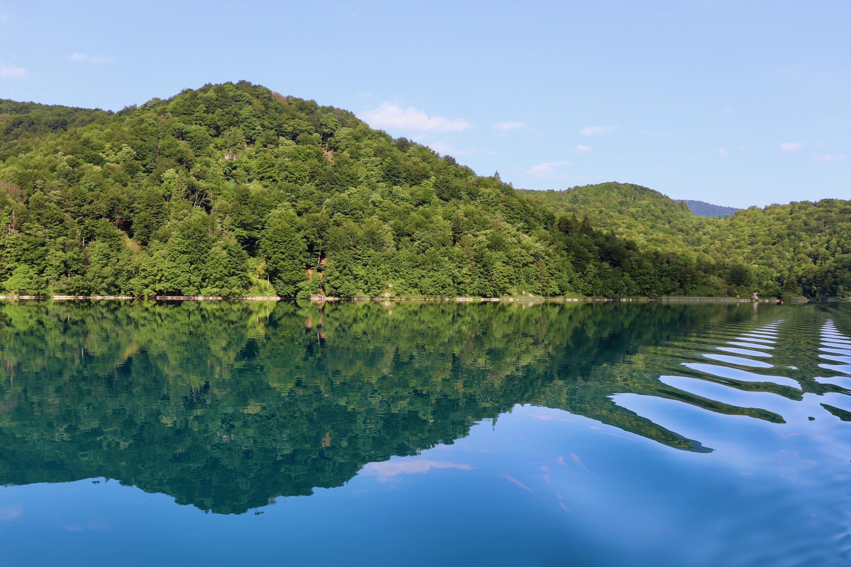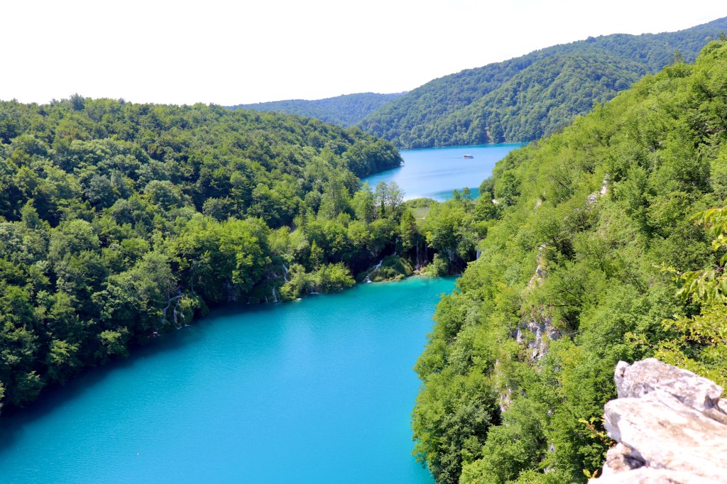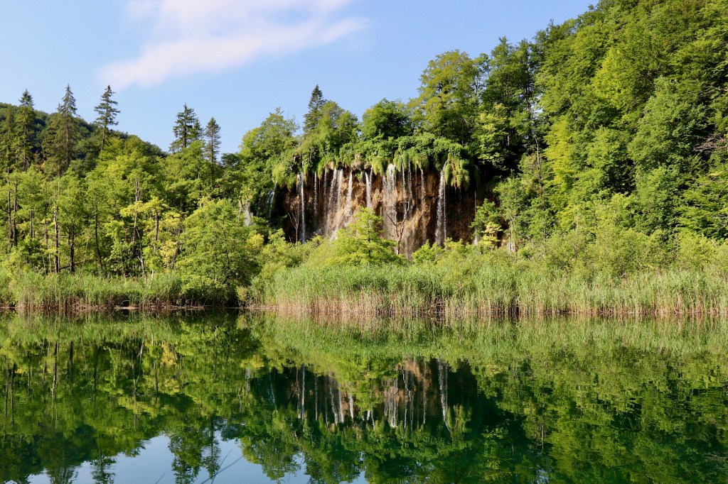 There are several itineraries named A through K, and we decided to follow C, which is a complete loop of the lower and the upper lakes, but added some must-do detours that I’ll get to in a moment. We checked out Veliki Slap (the big waterfall), and then walked south on the boardwalks to Kozjak Lake (P3 on maps). Crossing this lake on a boat was another one of our favorites, as the still water perfectly reflected the lush shores and the sky.