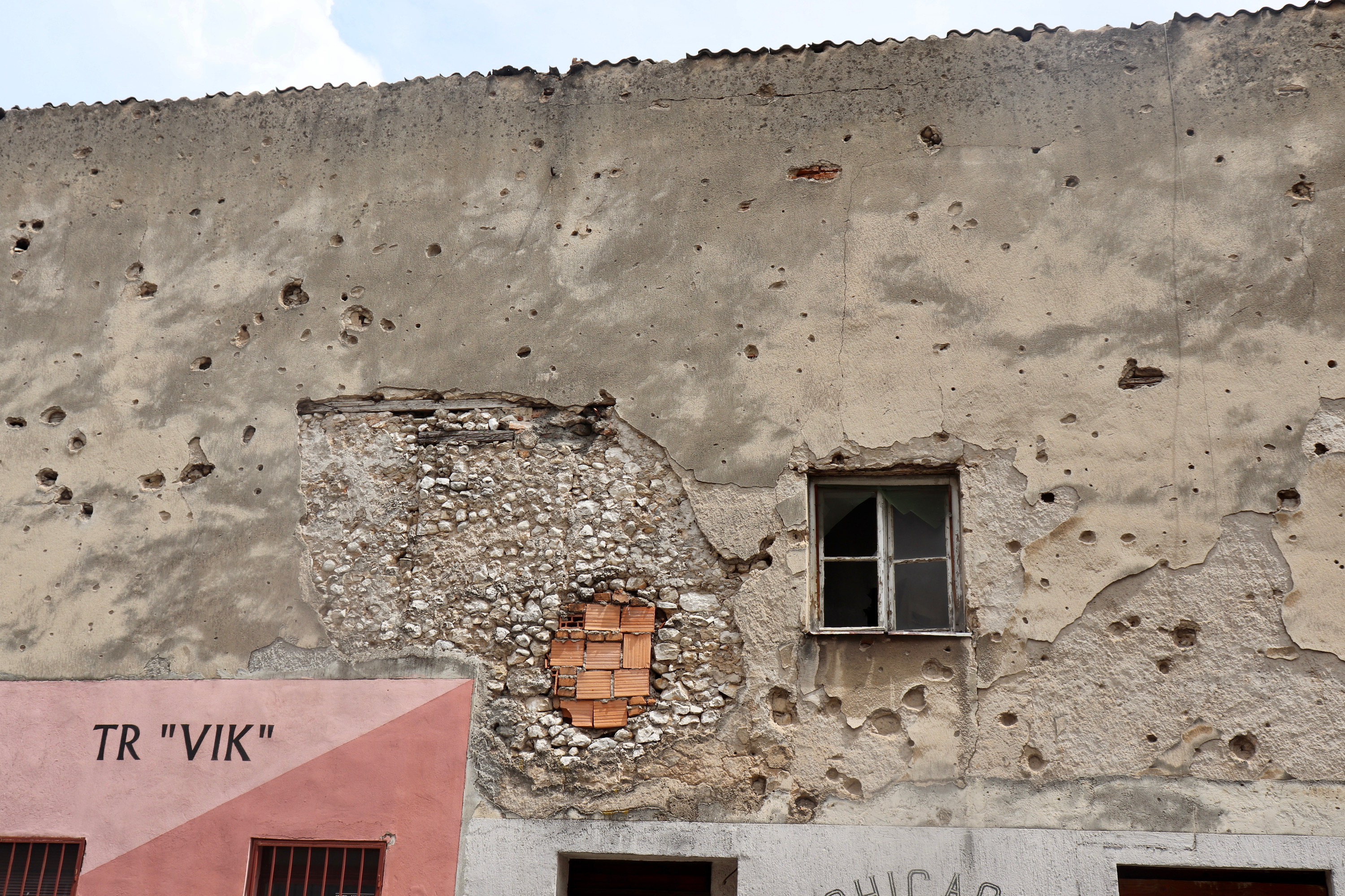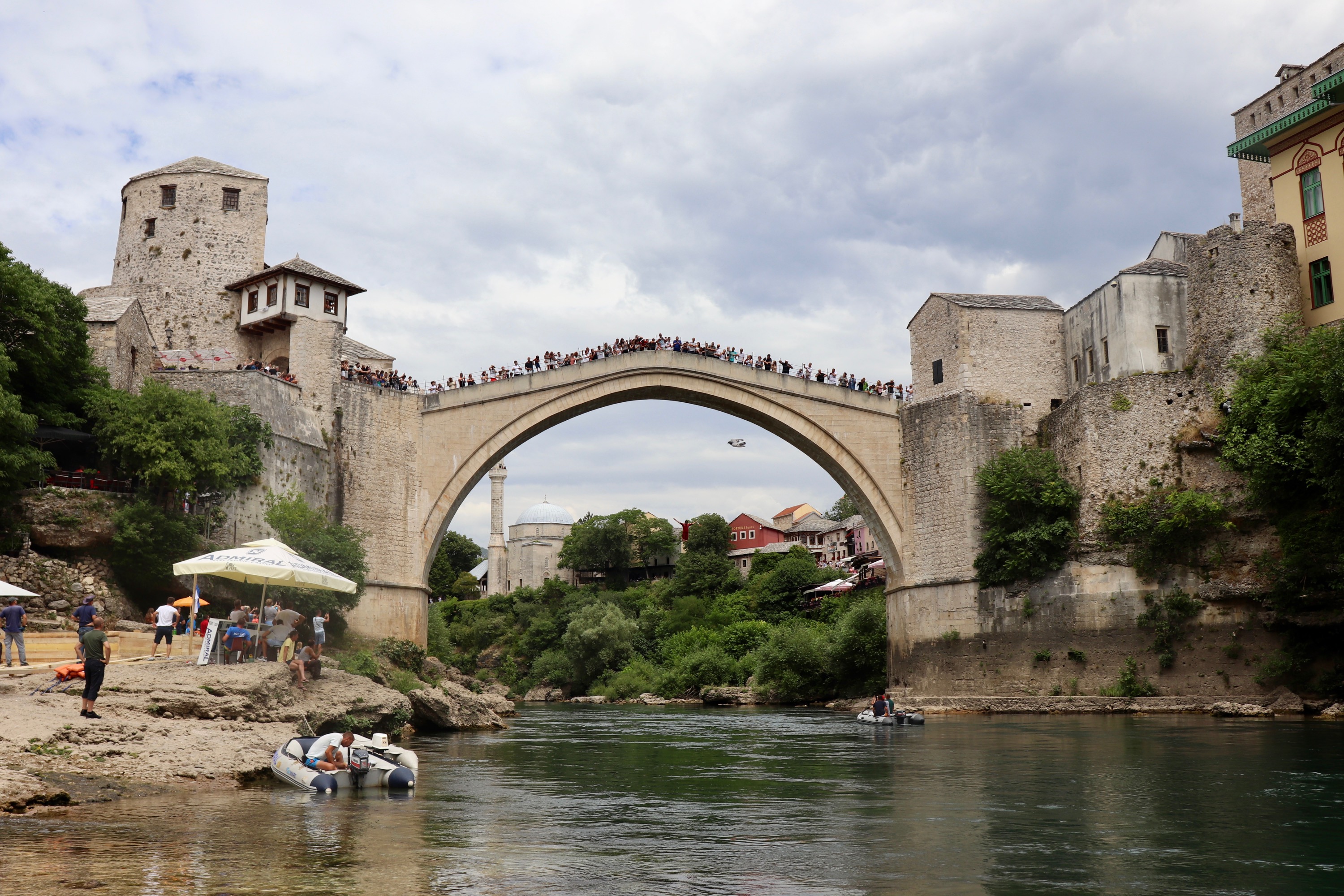 We crossed the bridge and walked down to the water, to get a better perspective, and wait for one of the locals to do one of the famous bridge jumps. We also walked further to the new bridge to get the best panorama of the bridge and the area. As we walked back, we checked out the crooked bridge, the “never forget” stone, and some of the buildings that remain riddled with bullet holes. The historic load of the city should have made for a fascinating if eerie visit. But unfortunately, I couldn’t get over how touristy and dirty everything was. Every stall at the bazaar was packed with the same cheap souvenirs, and they had dared to build a bar and a boat tour pier right under the Stari Most, ruining the view forever. The riverbank was full of trash, and it felt like everyone was smoking everywhere.