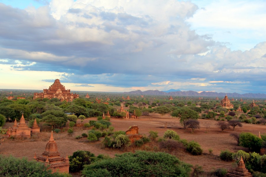 Bagan, with its more than 3,000 Buddhist temples from the 11-12th centuries, is one of the most amazing places I’ve been to. We arrived late in the afternoon, due to a torturous yet fun train ride form Yangon, and decided to stay in the village of Nyang U, where most backpackers’ hotels and restaurants are located. After finding a good accommodation (Blazing Hotel, $25 for a double with AC) and eating the most delicious meal ever (Weather Spoon), we set to check out the nearby temples by foot. With little day light left and intermittent rain, we at least had time to visit the golden Shwezigon Pagoda, a couple random temples in the Nyang U area, and play tag-o-war with some local kids. It was a good introduction to the archaeological site, enough to get us excited for the days ahead.